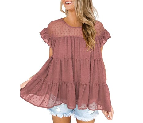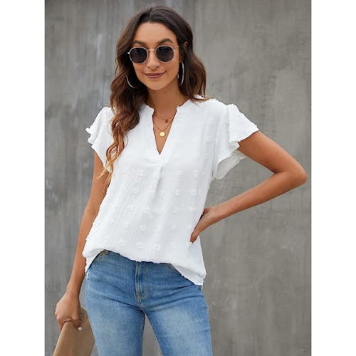 Amazon reviewers are totally in love with this short-sleeved top because it’s outfitted with the prettiest of details. There are fluttery sleeves, pleats, lace accents, and even a notched V-neckline. Plus, the lightweight fabric couldn’t be more comfortable to wear. The material features a touch of spandex for comfort.