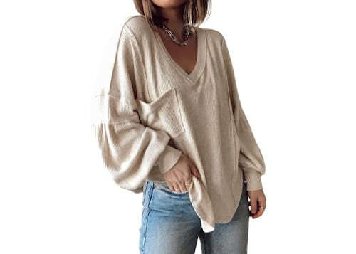 With its soft ribbed fabric, loose shape, and billowy sleeves, this has to be the most comfortable pullover on this list. And for just $35, it’s worth scooping up in multiple colors. Some of the options in the listing even feature a cute button detail.