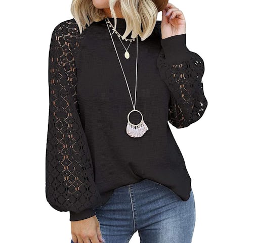 Made from a soft and breathable fabric, this loose-fitting top is supremely comfortable. But that doesn’t mean it foregoes fashion. The lace detailing on the sleeves is incredibly pretty, totally elevating the overall look. Choose from a bunch of color options in the listing, including neutrals and vibrant hues.