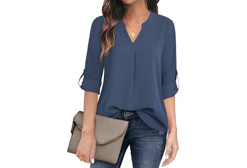 This pretty blouse is made from polyester, but it feels smooth and silky to the touch. The sleeves can be rolled up to three-fourths length (and buttons hold it in place) or worn regularly depending on the look you’re going for. This pick is suitable for work but even looks cute styled with jeans.