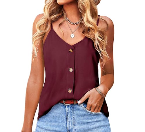 Lightweight and breathable, this chiffon tank top will allow you to stay breezy cool during the warmer months, though it makes a great layering piece as well for year-round wear. The V-neckline, button-up front, and spaghetti straps combine to make this pick more stylish than your average tank top.
