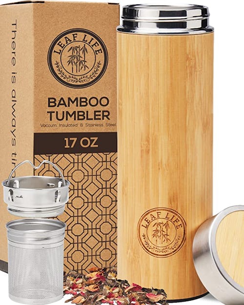 Not only will this double-wall vacuum-insulated bamboo tea thermos keep your tea hot for 12 hours or cold for 24 hours, it comes with an infuser and strainer for loose leaf tea. There are three sizes: 12-, 17-, and 22-ounces. One shopper noted, “I love how the bottle feels in my hand. The straining basket is extra fine, and it came with a free product warranty that I signed up for.”