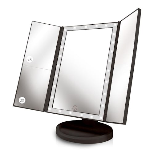 This trifold mirror features regular magnification, as well as 2X and 3X magnifications to make detailed tasks like tweezing or applying eye makeup easier. It has 36 built-in LED lights for superior illumination, and it’s powered by USB or AAA batteries.