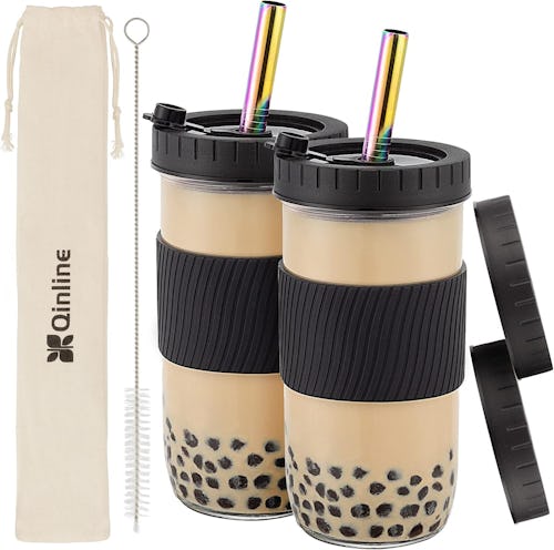 These glass cups are fantastic for at-home bubble tea, but also for other drinks like smoothies, iced coffee, and protein shakes. They feature a wide mouth for easy pouring and also included are four lids, two silicone sleeves, two stainless steel straws, replacement pieces, and a cleaning brush.