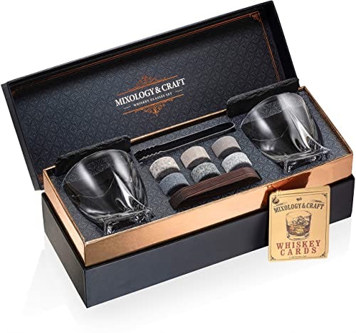 This whiskey set comes with everything needed to enjoy a pour of your favorite brand (except the bottle, of course). Each of the two crystal glasses have a unique twisted shape and holds up to 10 ounces. Place the six granite stones in your freezer, then plop them into your glass to chill your drink without watering it down. Also included are two stone coasters, metal tongs, cocktail cards, and even a gift box.