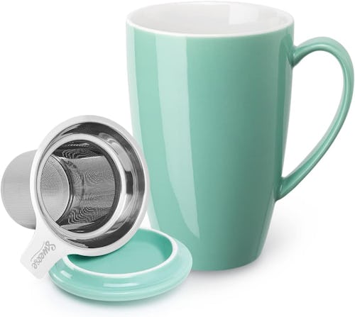 This ceramic tea cup is a tea connoisseur’s dream. It comes with a fine mesh metal infuser that sits neatly at the rim of the cup so you can steep all kinds of loose teas. The thick ceramic cup and lid (that doubles as a coaster) are designed to keep your tea warm — and all pieces are dishwasher safe.
