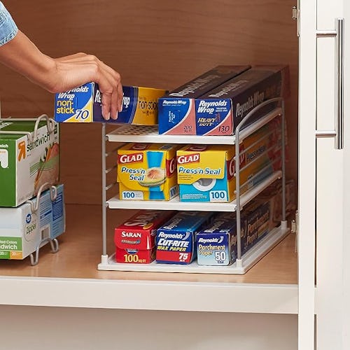 Your plastic bags, foil, plastic wrap, and parchment paper will finally have a designated spot with this adjustable box organizer in your kitchen or pantry. The shelves adjust in 1-inch increments to fit whatever you’d like to store on them and can hold 20 pounds each. A larger version is also available in the listing.