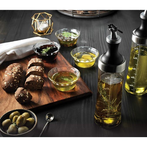 This set of two oil and vinegar dispensers gives you control over how much oil and vinegar you use in your favorite recipe and they feature handy measurements on the side for accuracy. They’re made of glass, stainless steel, and BPA-free plastic, and they have wide mouths for easy refilling.